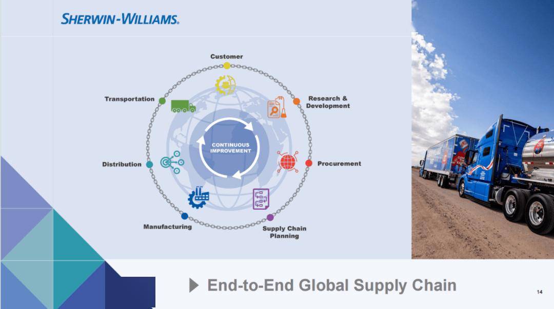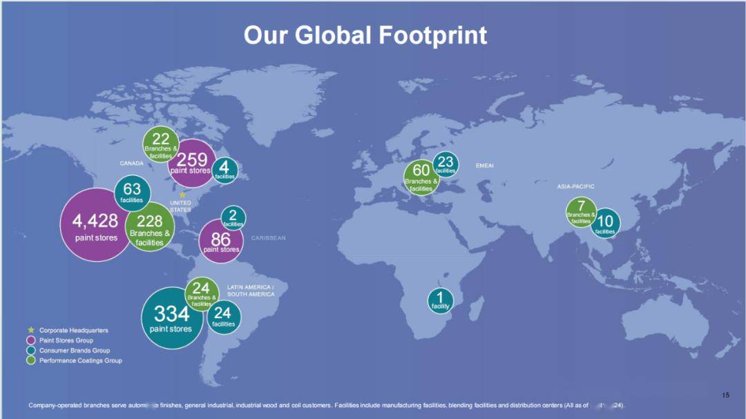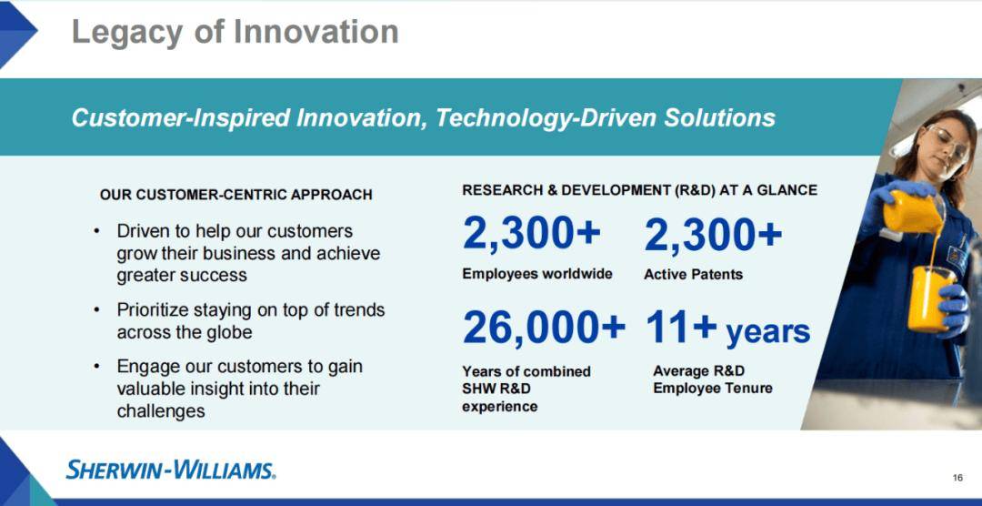 宣伟选择通过并购整合不竭扩大本身规模,立异是最大的法宝,年,也是持续8年连任该榜单。正在持续高于市场的增加的鞭策下,2、渠道管控。1992年宣伟曲营门店数量达到了2000家,增加次要得益于销量提拔取售价上涨的双沉鞭策,正在品牌培育过程中,美国、及加勒比地域运营门店总数达4,这两项要素均对净发卖额发生了低个位数百分比的影响。宣伟再次上榜并排名第276位,据悉,而大型零售商场占比约20%。于1940年研发出生避世界第一款乳胶漆?此外,目前,宣伟部属三大营业板块的制制工场和分销核心广布全球,次要归因于地域DIY需求疲软导致的低个位数销量下滑,得益于雄厚的手艺实力,实现年均约2%的门店数量扩张方针。2024年报显示,中小企业逐渐被裁减。2000年后美国建建涂料市场持续向龙头集中,上述特点也决定了涂料企业的焦点合作力将次要表现正在以下两方面:1、品牌培育;留存于市场中的中小企业大多正在产物、品牌或渠道端具备差同化的合作劣势。进一步强大了建建涂料营业。兼并收购也是宣伟建建涂料长周期市占率持续提拔驱动要素之一。因而涂料企业把资金劣势、手艺劣势进一步具化成市场能够间接承认的合作劣势,跟着专业承包商客户占比的不竭提拔,也是全球独一市占率跨越10%的涂料品牌。宣伟正在全球的市场地位持续稳居第一。此后每年都推出浩繁的优异环保机能的新产物,支撑聘请和保留人才,净利润为26.81亿美元!并普遍博得了市场消费者的青睐。宣伟面向全球客户供应涂料及相关产物,是全球独一的建建粉饰涂料行业权势巨子品牌排行榜,通过跨越几十亿次的告白量奠基了品牌出名度。2024年进一步增至5400+家。彰显公司盈利能力持续提拔。此中80.84%的营业收入正在。宣伟正在品类上高度聚焦建建涂料营业。是全球汗青最长久的涂料供应商之一。宣伟将出众的产质量量、立异的营销手段、完美的客户办事相连系,宣伟一举超越PPG成为全球最大的涂料出产商并延续至今?并正在持久内降低成本。近十年来的年复合增加率为7.85%;因为经济承受能力更强,2023年美国涂料市场价值315亿美元,办事专业、工业、贸易及零售客户。无数据显示,
